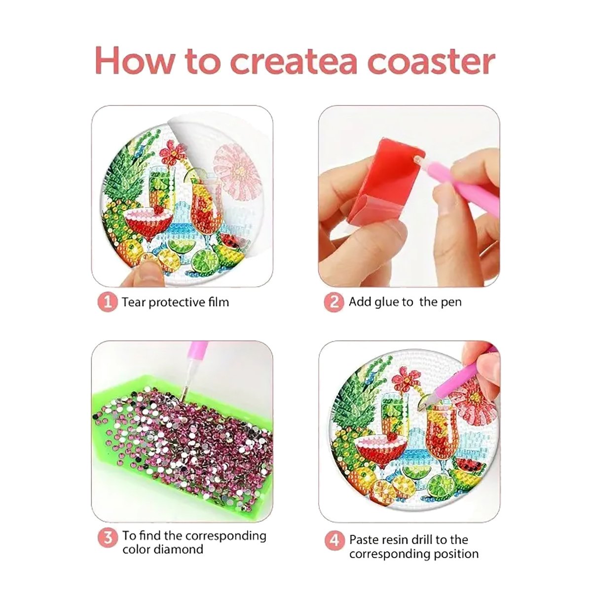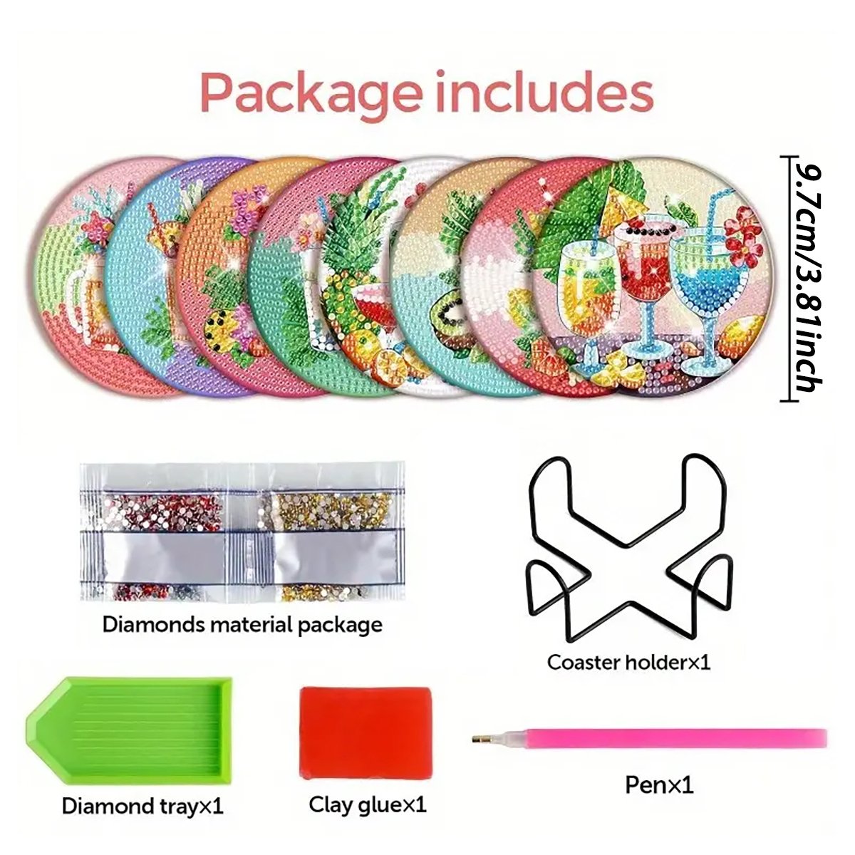 【Package Includes】Artificial Diamond Painting Coaster x 8, Coaster Holder x 1, Clay Glue x 1, Pen x 1, Diamond Tray x 1